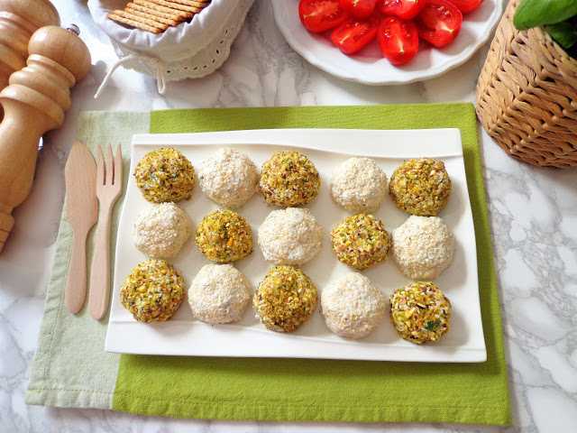 500 g di ricotta50 g di pistacchi50 g di sesamo50 g di parmigianobasilico, salvia, prezzemolosale, pepe