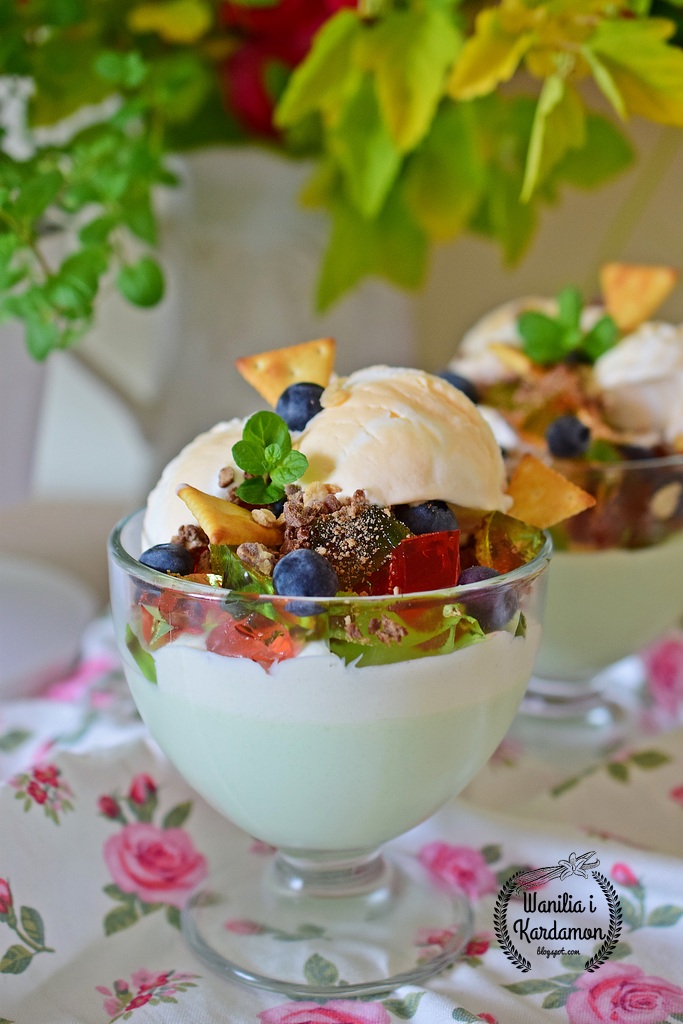 Ptasie mleczko, warstwa śmietanki, tęczowa galaretka ,owoce i lody, całość udekorowana jest z grubsza