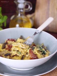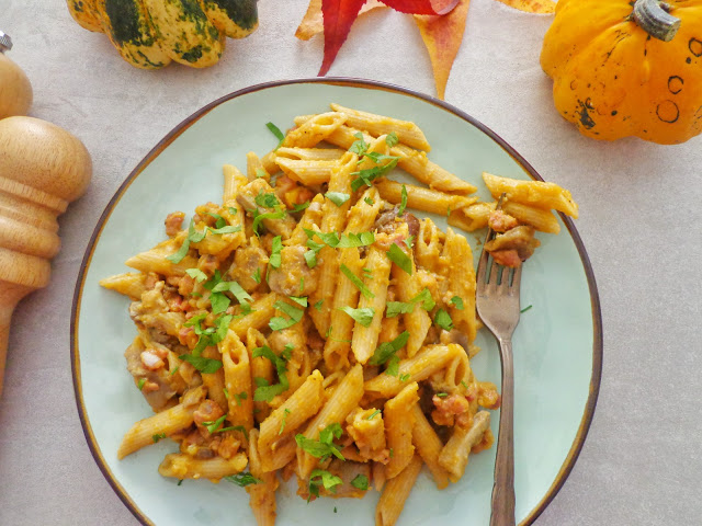 Penne z dynią, grzybami i boczkiem (Penne con zucca, funghi e pancetta)