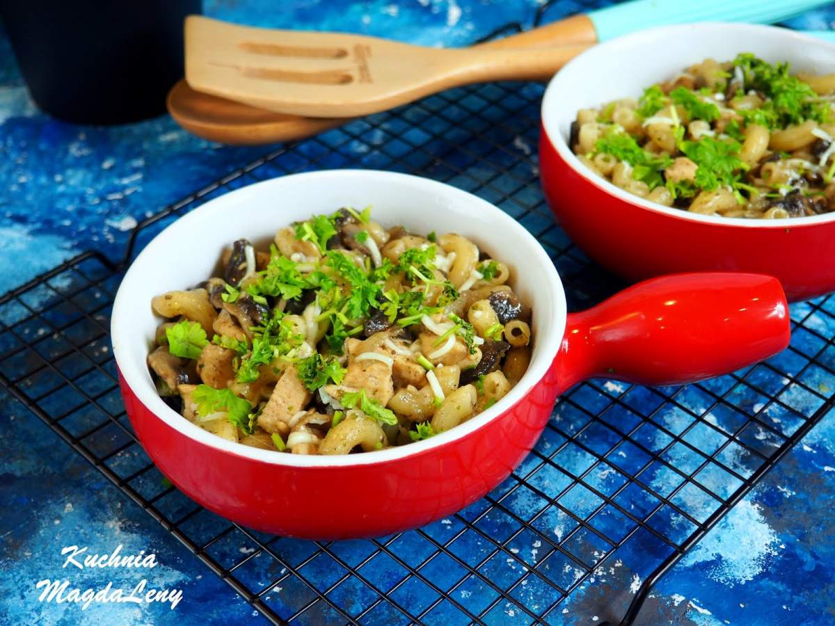 KURCZAK Z PIECZARKAMI I MAKARONEM