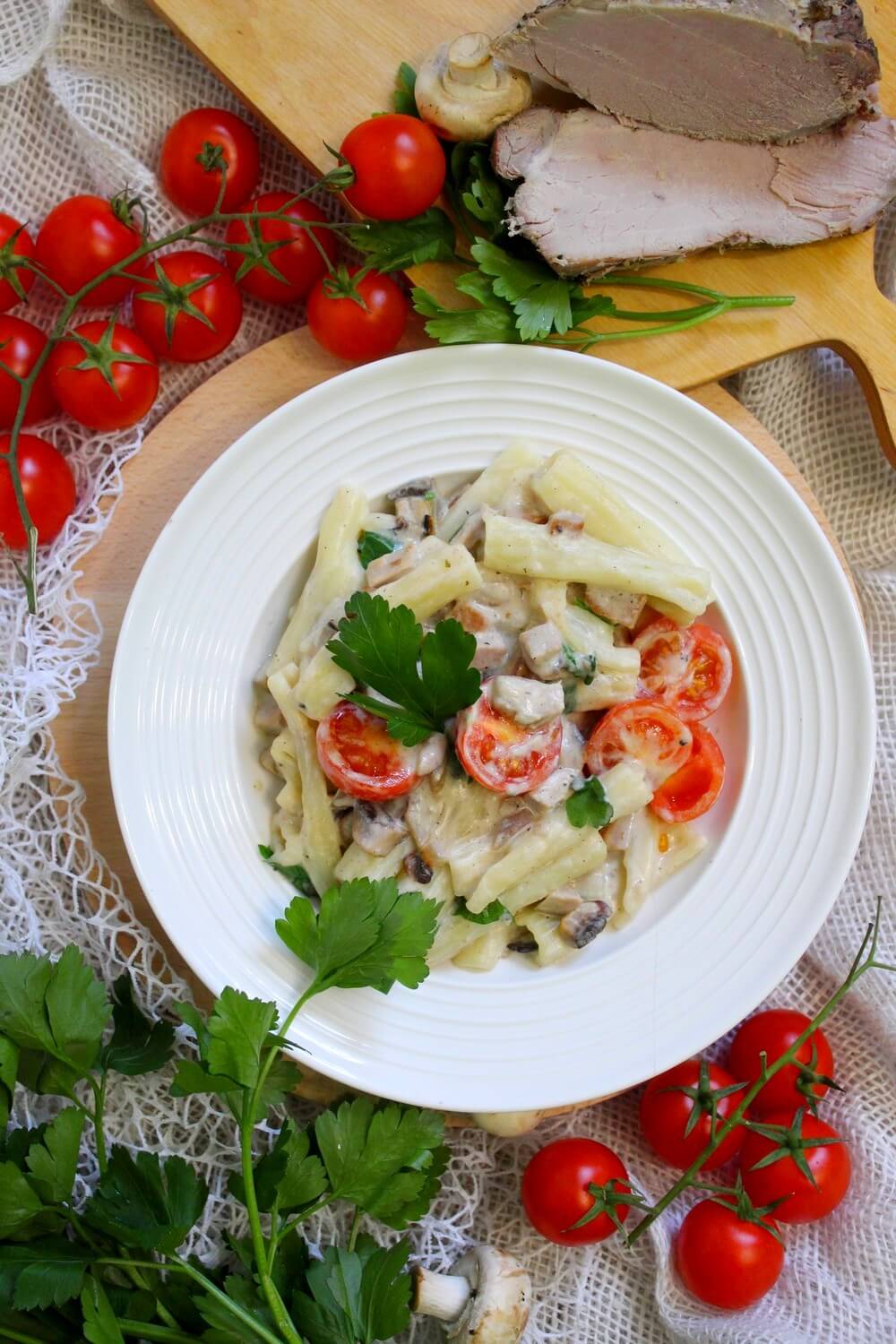 Makaron z szynką, pieczarkami i pomidorkami w sosie śmietanowym Szukacie pomysłu na…