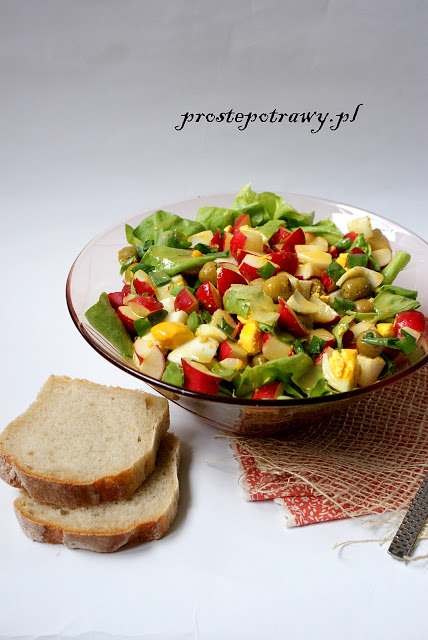 mała główka sałaty3-4 jajkaok. 6 łyżek zielonych oliwekpęczek rzodkiewek i szczypiorkusól, pieprzPrzygotowanie :Sałatę umyć, porozrywać na małe kawałkiOliwki osączyć z zalewyUgotowane jajka pokroić, rzodkiewki również pokroićSkładniki wymieszać, posypać pokrojonym szczypiorkiem, doprawic do smaku sola i pieprzem.Składniki na sos:duża łyżka