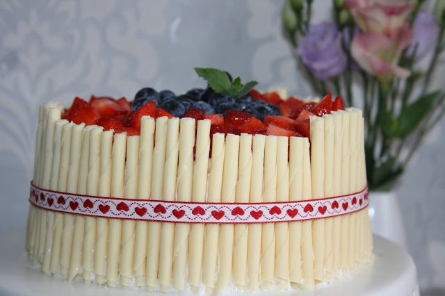 Obłożony pyszna białą czekoladą, a pokryty mnóstwem świeżych owoców. Polubią nie tylko dzieciaki. Gwarantuję !