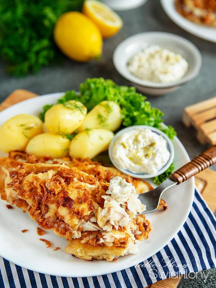 RYBA W PANIERCE ZAPIEKANA Z SEREM I PRAŻONĄ CEBULKĄ, Z TZATZIKAMI I MŁODYMI ZIEMNIAKAMI