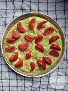 Pełnoziarnista tarta z młodymi ziemniakami, szpinakiem i czosnkowym serkiem