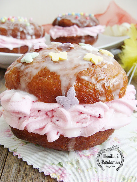 Złociste pączki z kremem malinowym