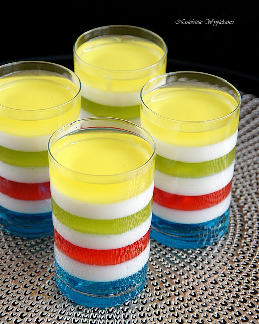 To tak w ramach wczorajszego Dnia Dziecka ;). Tęczowe galaretki kuszące oczy małych i dużych! Wykorzystując całe opakowania poszczególnych galaretek (a nie tak jak ja- tylko 1/3 opakowań), otrzymacie 12 takich deserków. Obiecuję, że Wasze dzieci będą prze szczęśliwe!