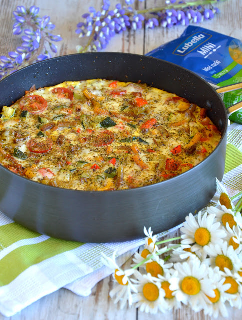 Przepyszna propozycja na sycące śniadanie lub obiad. Ostatnio często robię frittatę z różnymi dodatkami. W tej wersji jest bardzo kolorowo, a to za sprawą makaronu Lubella mini i warzyw takich jak cukinia, czerwona papryka i pomidorki koktajlowe. Całość dopełnia idealnie dobrana mieszanka przypraw i ziół. Jest pysznie 😉