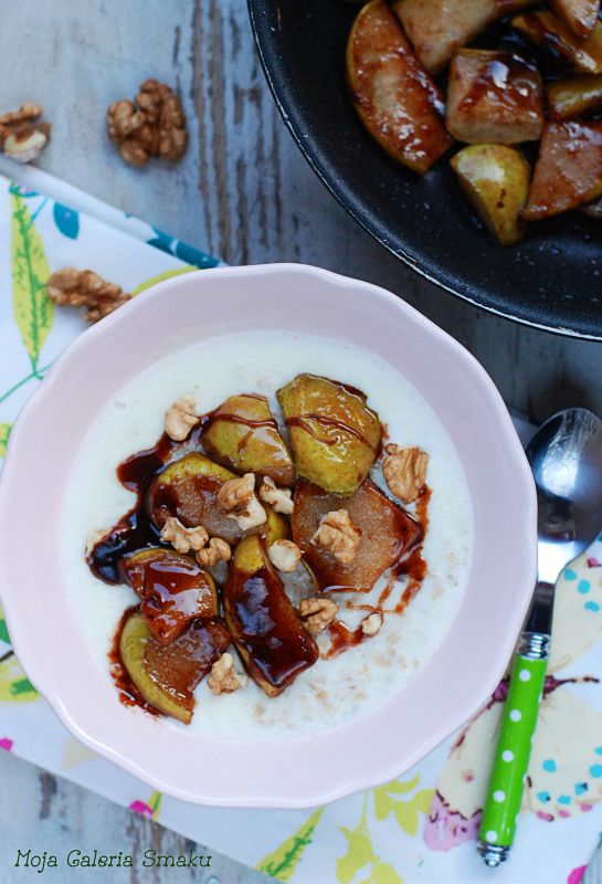 Składniki na 1 porcję:1 szklanka mleka2 łyżki płatków owsianych1 gruszka1 łyżeczka miodu1-1/2 łyżeczki cynamonukilka orzechów włoskich1 łyżeczka masła