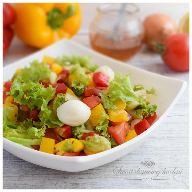 4-5 liści sałaty, 1 żółta papryka, 1 czerwona papryka,1 cebula, 3-4 średnie pomidory,mini mozzarella (opakowanie 125 g).Sos miodowy winegret:szczypta soli morskiej,2 łyżki miodu,1 łyżka soku z cytryny,świeżo zmielony czarny pieprz,1 łyżeczka ziół prowansalskich,4 łyżki oliwy z pierwszego tłoczenia.