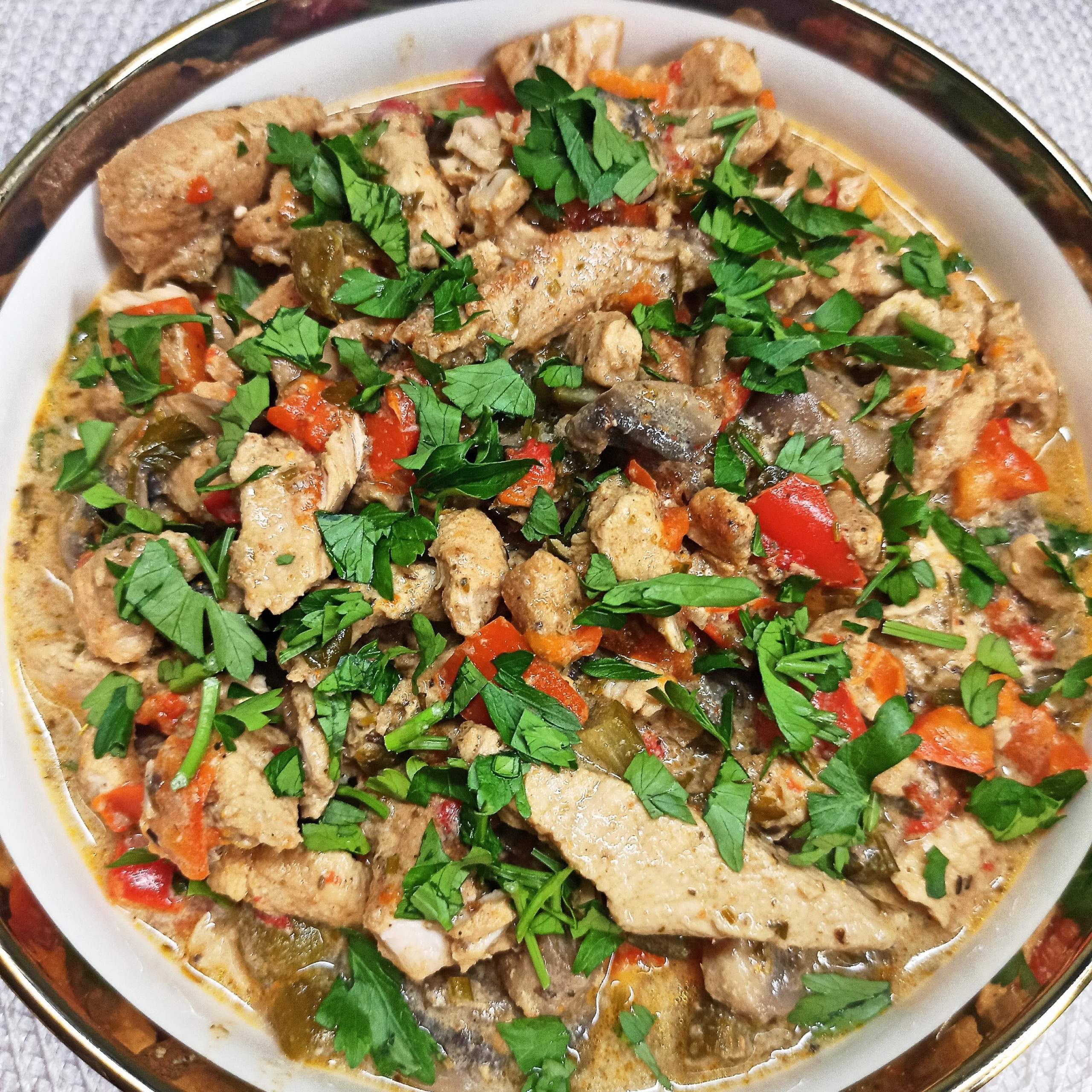 Smaczny i pożywny gulasz drobiowy z pieczarkami, papryką i cukinią. Gulasz drobiowy…
