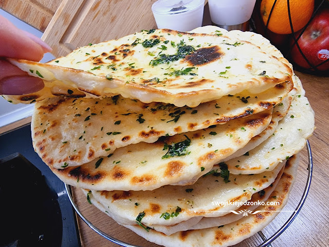 Pyszne płaskie pieczywo, posmarowane masłem z odrobiną czosnku i natki pietruszki. Drożdżowe…