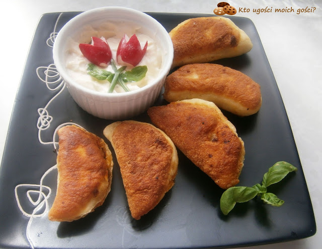 Pierożki drożdżowe z kurczakiem, pieczarkami i serem żółtym