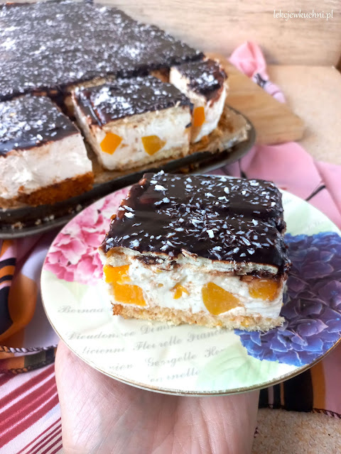 Kostka sernikowa z brzoskwiniami (sernik na biszkopcie) przepis Kostka sernikowa z brzoskwiniami…