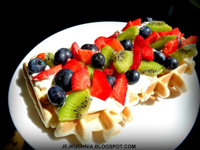 Składniki na gofry:1,5 szklanki mąki,2 jajka,1/8 łyżeczki soli,1/4 szklanki cukru,łyżeczka cukru