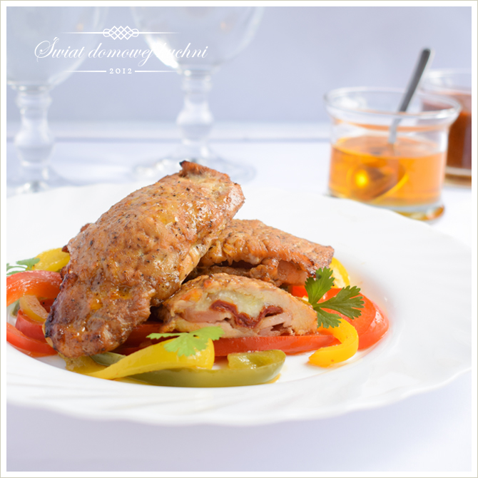 600 g schabu bez kości,1 czerwona papryka,1 żółta papryka,1 zielona papryka,150 g pomidorów suszonych, 100 g boczku wędzonego,100 g tarkowanego sera Mozzarella,20 g masło,1/2 słoiczka marynaty Kujawski „Ostra papryka – czosnek – zioła”,olej,sól,pieprz.