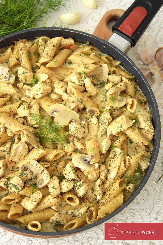 Kiedy nie mam czasu na przygotowanie czasochłonnych dań, wtedy najczęściej przygotowuję szybkie dania z patelni – zwykle jest to kurczak z warzywkami plus ryż. Tym razem przygotowałam kurczaka z makaronem penne w sosie koperkowo-czosnkowym. To bardzo smaczne danie dla dwóch osób na dwa dni (ok. 4 porcje). Ja dodałam pieczarki,