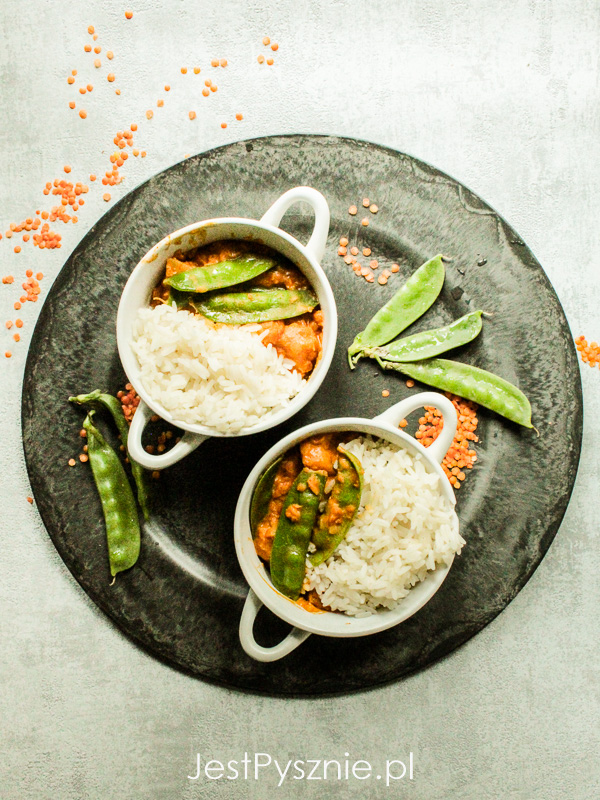 Curry kokosowe z soczewicą, dynią i groszkiem cukrowym