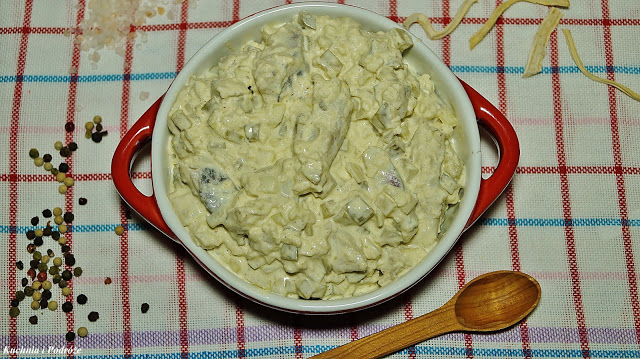Ravioli gotujemy według przepisu na opakowaniu. Oliwki, paprykę, bazylię i cebulę kroimy drobno i doprawiamy sałatkę majonezem oraz solą i pieprzem do smaku.