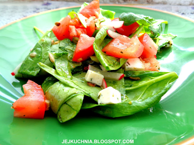 Składniki:200 g szpinaku,2 nieduże pomidory,50-100 g sera Lazur z niebieską pleśnią,6