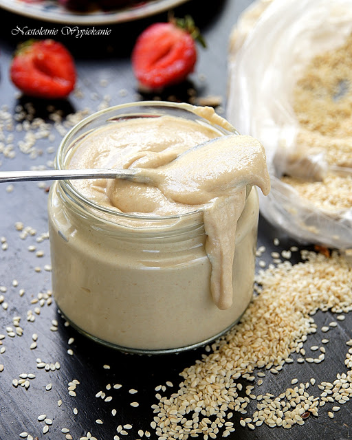 Na jednych z ostatnich warsztatów (dokładnie tych- klik relacja) przygotowywaliśmy fit słodycze, gdzie do zdrowych babeczek na dowolnym spodzie (u mnie były to zmielone orzechy laskowe z masłem orzechowym i syropem z agawy) użyliśmy właśnie tahini, czyli pasty sezamowej. Pastę tą robi się z dwóch składników, a