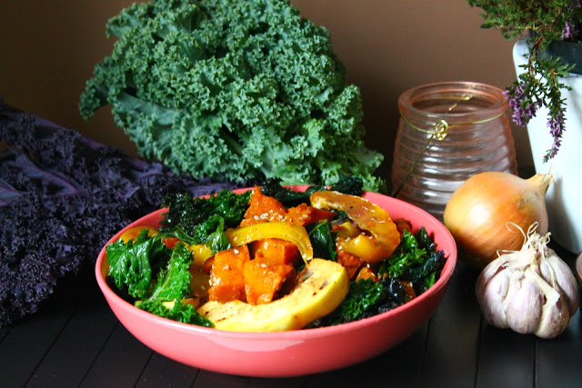 Sałatka z pieczoną dynią, jarmużem i grillowanymi warzywami