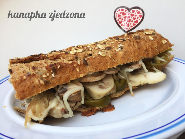 Za późno na śniadanie, a za wcześnie na obiad. Lancz, brancz czy drugie śniadanie, nie istotne. Ważne, jest mieć dobry pretekst, żeby zjeść kanapkę na ciepło. Pełnoziarnista bagietka, w której wnętrzu kryje się coś pysznego jest świetnym rozwiązaniem. Kawałki pieczonego kurczaka, plasterki papryczki jalapeno, pieczarki i ciągnąca się mozzarella,