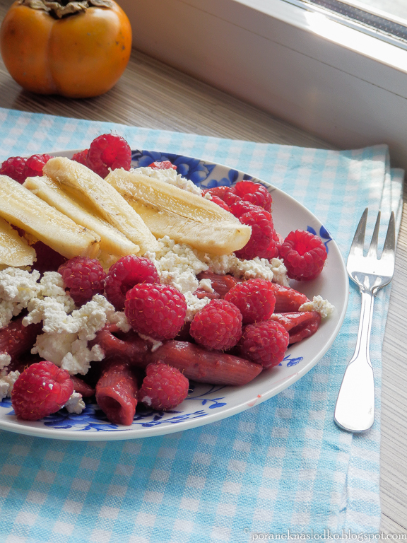 Makaron w sosie kasztanowo-owocowym podany z twarogiem, malinami i bananem; woda kokosowa…