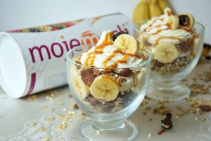 Pyszny deser w 10 minut? To możliwe! Polecam Wam bananowy deser 5 składnikowy z sosem toffi. Bazą w deserze jest chrupiące musli ciasteczkowe ze sklepu internetowego Moje Musli.
