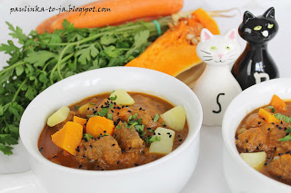 Ulubione danie w Naszym domu – gulasz. Możemy do niego wrzucić dosłownie wszystko. Przy tym nie jest pracochłonny i zawiera solidną porcję mięsa i warzyw. Gulasz przygotowałam z mięsa wołowego oraz z warzyw: cebuli, dyni, marchewki, ziemniaków i pomidorów. Przyprawiłam go aromatycznymi ziołami i ostrym ketchupem. Do gulaszu użyłam również