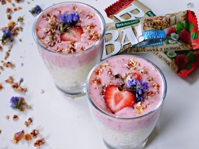 Przepyszny, letni deser, który przygotujecie w kilka chwil! Delikatna warstwa jaglana w połączeniu z orzeźwiającym musem truskawkowym i posypką z batoników zbożowych świetnie zaspokaja apetyt na słodkie. Te od Bakalland’u to ostatnio jedne z moich ulubionych, mają niemalże idealny skład. 💗