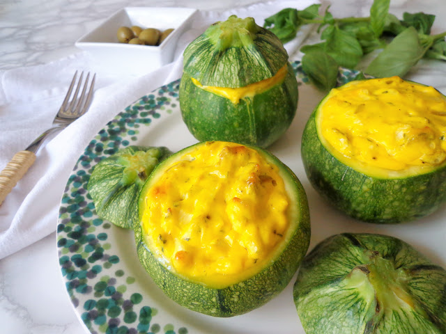4 zucchine tonde200 g di formaggio tipo philadelphia50 g di olive verdi2 tuorli1 spicchio d’agliooriganobasilicoolio