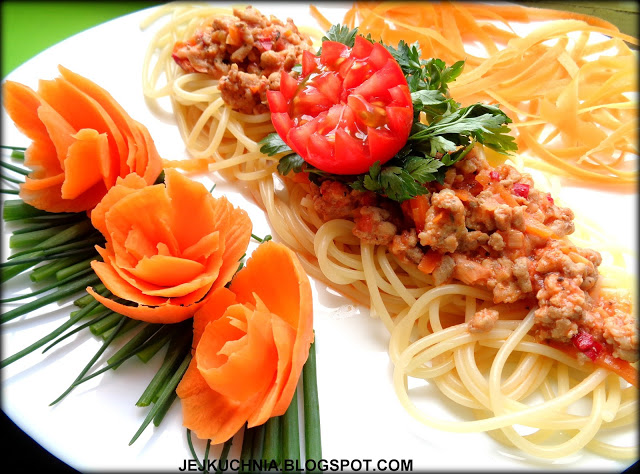 Składniki:200 g makaronu spaghetti,30-40 dag mięsa mielonego,kawałek pora,1/2 średniej marchewki,200 ml bulionu warzywnego (może być z