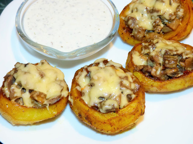 Uwielbiam tą przekąskę…gorące, pieczone ziemniaczki, nafaszerowane pieczarkami i otulone ciągnącym się serkiem…