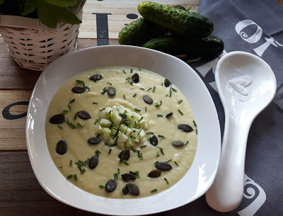 Gęsta i sycąca zupa krem z zielonego ogórka i awokado, podana z pestkami dyni oraz szczypiorkiem. Bardzo szybka w wykonaniu, a do tego smaczna i zdrowa. Polecana osobą zabieganym, a także tym, którzy nie mają ochoty na stanie w kuchni, zwłaszcza latem 😉