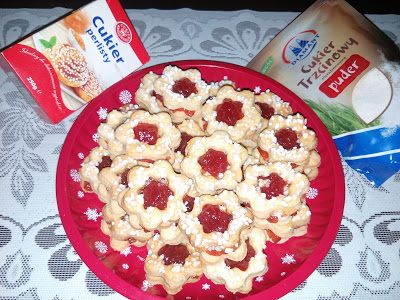 Ciasto:3 szklanki mąki4 żółtka2 łyki trzcinowego cukru pudru Diamant1/2 łyżeczki proszku do pieczenia250 g kostka margaryny1 łyżka cukru waniliowegoDodatkowo:1 słoiczek ulubionego dżemu np. truskawkowycukier perlisty Cukier KrólewskiPrzygotowanie:Mąkę z cukrem pudrem i proszkiem do pieczenia przesiać, dodać cukier waniliowy. Schłodzoną margarynę dzielimy na małe kawałki. Wysiekać ciasto do momentu
