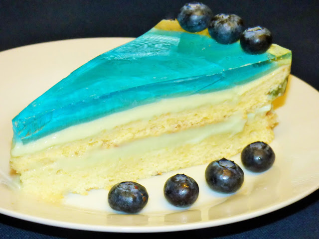 Ciasto biszkoptowe, przełożone kremem budyniowym z galaretką o smaku owoców leśnych…a to…