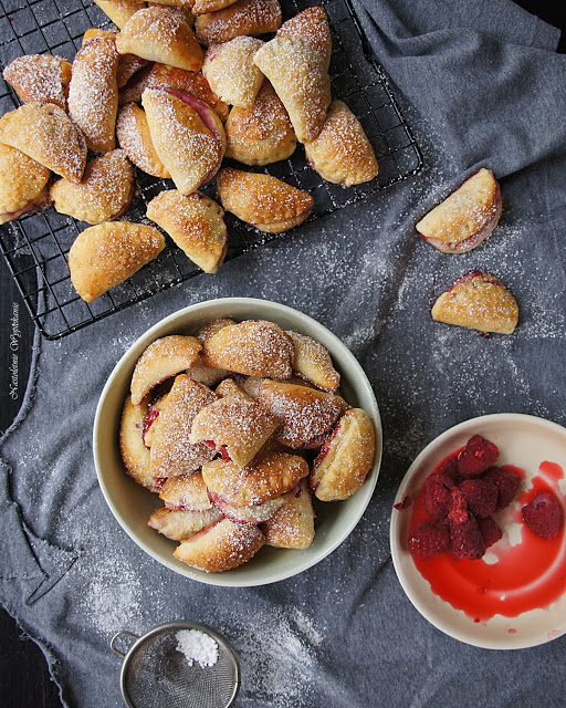 Przedstawiam pierożki- na słodko, z malinami, z ciasta krucho-drożdżowego. Dosłownie na jeden kęs! Z gorącą herbatą albo świeżym mlekiem to zestawienie bezkonkurencyjne. Jeśli masz zamiar postawić na stół gotowe sklepowe ciastka w celu poczęstunku dla gości, to jest ten moment, by zrobić coś samemu ;). Malinowe pierożki przekonają