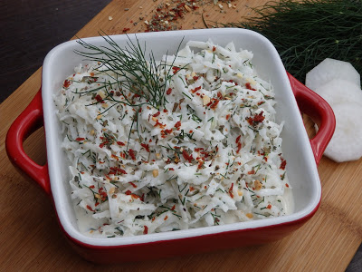 Polecam surówkę z letniej rzodkwi z dodatkiem koperku. Jest bardzo prosta i smaczna. Moja rzodkiew nie była bardzo ostra więc porządnie ją doprawiłam solą, pieprzem oraz suszonymi pomidorami z czosnkiem i bazylią. Jeśli rzodkiew jest bardzo ostra w smaku polecam połączyć ją