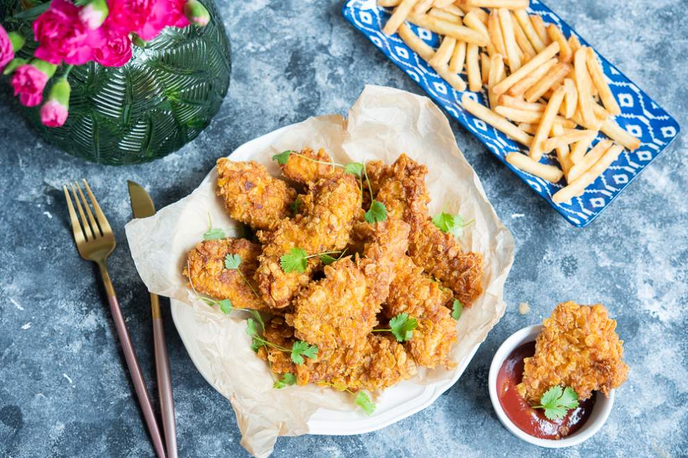 Stripsy z kurczaka w chrupiącej, kukurydzianej panierce to pyszny pomysł na obiad.…