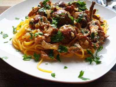 Mój niedzielny obiad…mini pulpeciki z mięsa indyczego, pieczone w piekarniku podane z sosem kurkowym oraz makaronem typu spaghetti. Obiad trochę pracochłonny, ale od „święta” możemy się poświęcić, aby zjeść coś naprawdę pysznego 😉 Najwięcej czasu zajmuje tu oczyszczenie kurek oraz formowanie kulek mięsnych, później to już z górki 😉