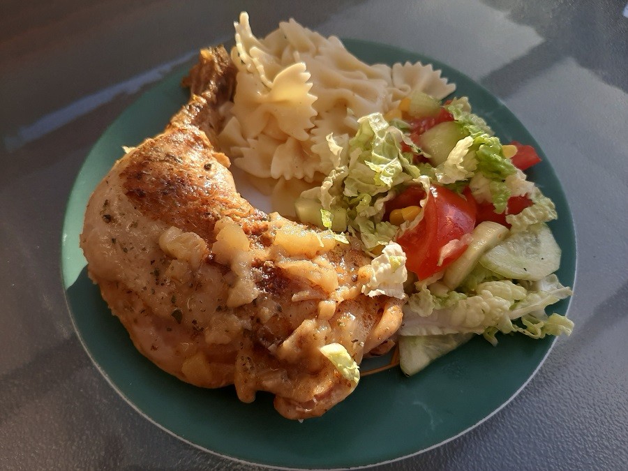 Udka z kurczaka podsmażane i duszone pod pierzynką z jabłek. Świetnie się…