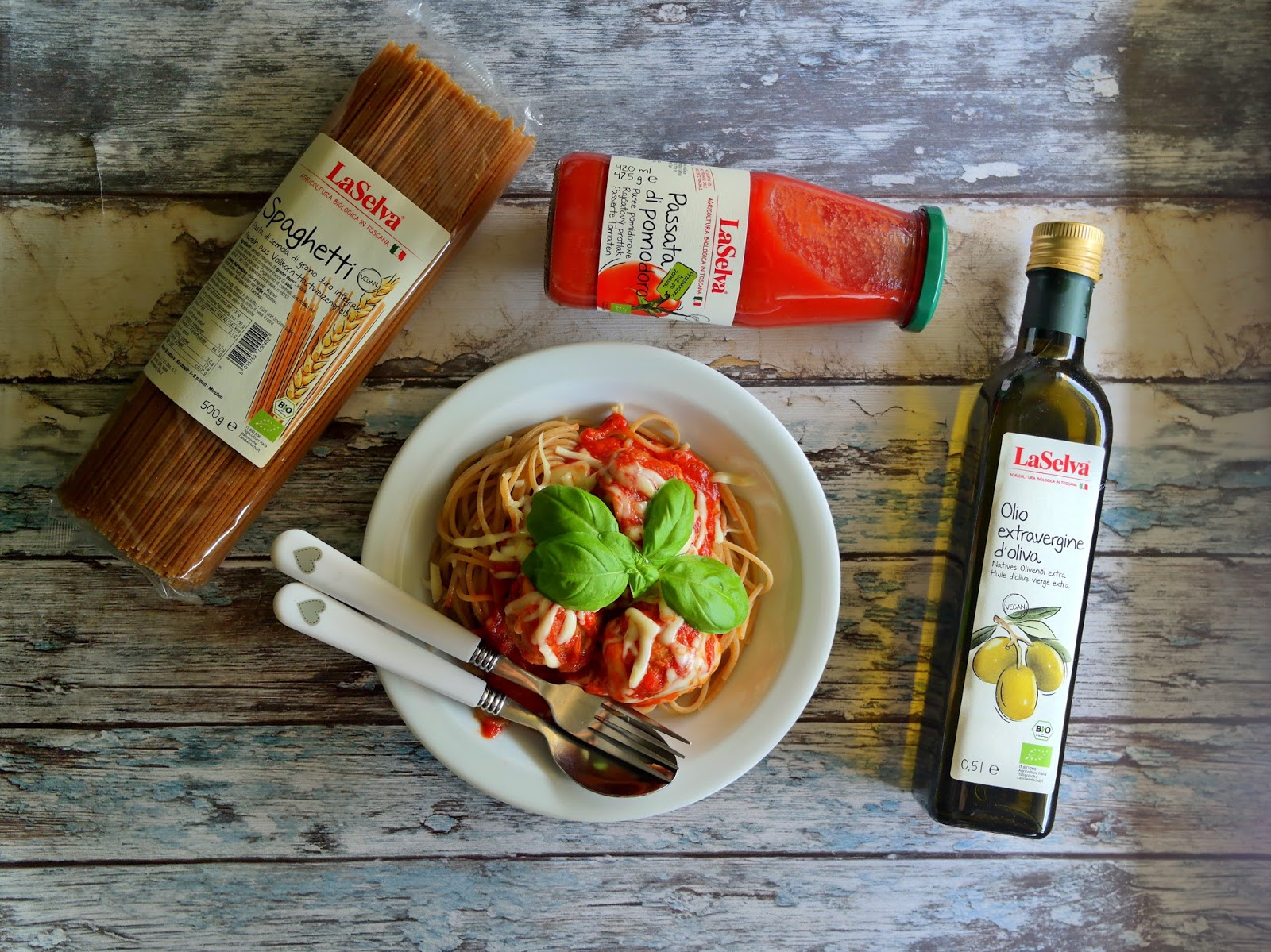 Taki obiad to marzenie – ale takie do spełnienia, poważnie! 🙂 Pyszny orzeźwiający pomidorowy sos, w którym skąpane są miękkie i soczyste mięsno warzywne kulki. Zaraz przekonacie się co udało mi się w nich ukryć! Do tego sycący pełnoziarnisty makaron spaghetti. Jest nawet szansa, że poczujecie się w tym naszym