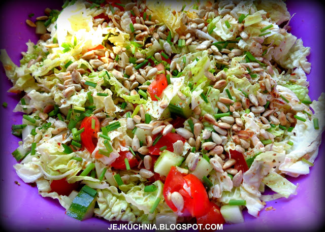 Składniki:nieduża kapusta pekińska,250 g pomidorków koktajlowych,nieduży ogórek zielony,garść ziaren słonecznika,garść posiekanego szczypiorku,2 łyżki