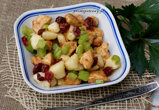 filet z kurczakagarść żurawiny3 gałązki selera naciowego2 twarde gruszkiprzyprawa gyrosolej, musztarda, miód, sok z cytryny