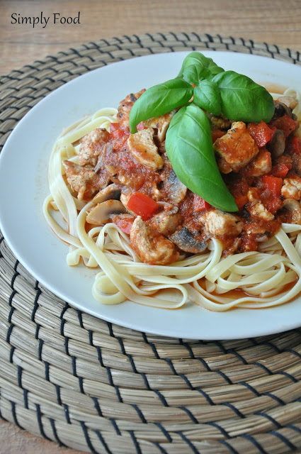 Zwykle makaron w sosie pomidorowym przygotowuję z mięsem mielonym, tym razem użyłam piersi z kurczaka. Do tego kilka warzyw takich jak czerwona papryka, cebula oraz pieczarki i pyszne danie na obiad było gotowe 🙂
