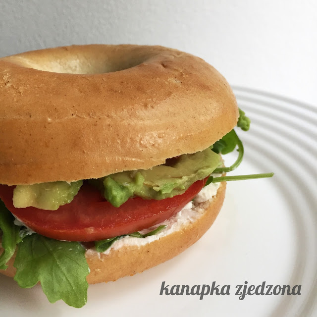 Dobry bajgiel to rzadkość, więc jak takiego dorwę, to posta sobie odmówić nie mogę. W warunkach wakacyjnych ciężko o wyszukane składniki z domowej spiżarki, więc będzie skromnie, ale z bajglem. Przekrojonego na pół posmarowałam jogurtowym twarożkiem, obsypałam świeżą chrupiącą rukolą, przełożyłam plastrami pomidora i dojrzałego awokado.