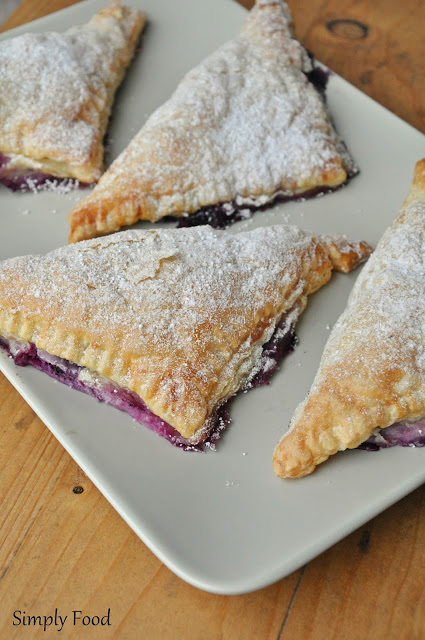 Te nadziewane twarogiem i borówkami amerykańskimi ciasteczka powstały zupełnie przypadkiem, gdy nie wiedziałam co zrobić z nadmiarem owoców, którymi obdarowała nas rodzina. Wymyśliłam więc trójkąciki z ciasta francuskiego i wyszło całkiem smacznie, w każdym razie na deser ciasteczka sprawdziły się idealnie, bo takie świeżo upieczone i chrupiące