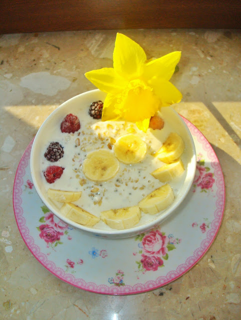 Owsianka na mleku kokosowym z bananem i jeżynami. My też się uśmiechamy…