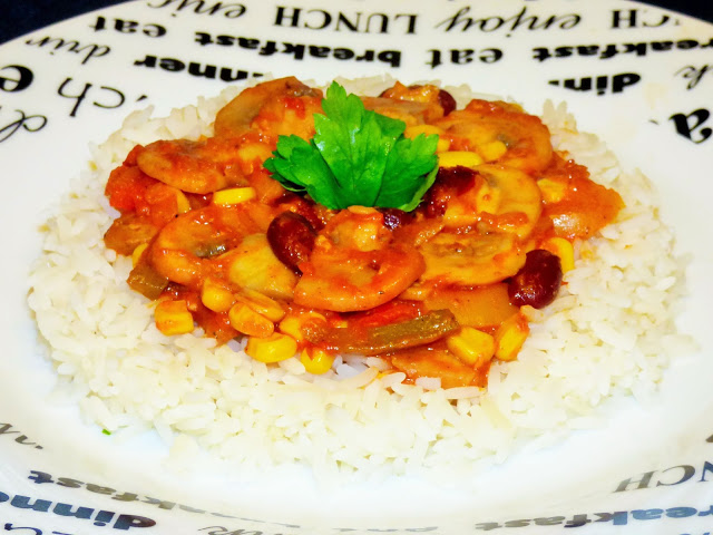 Ryż z pieczarkami i warzywami w sosie pomidorowym